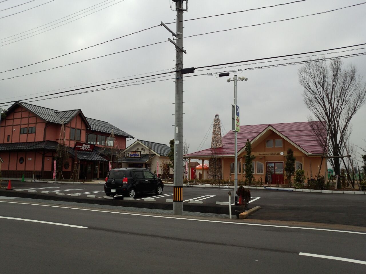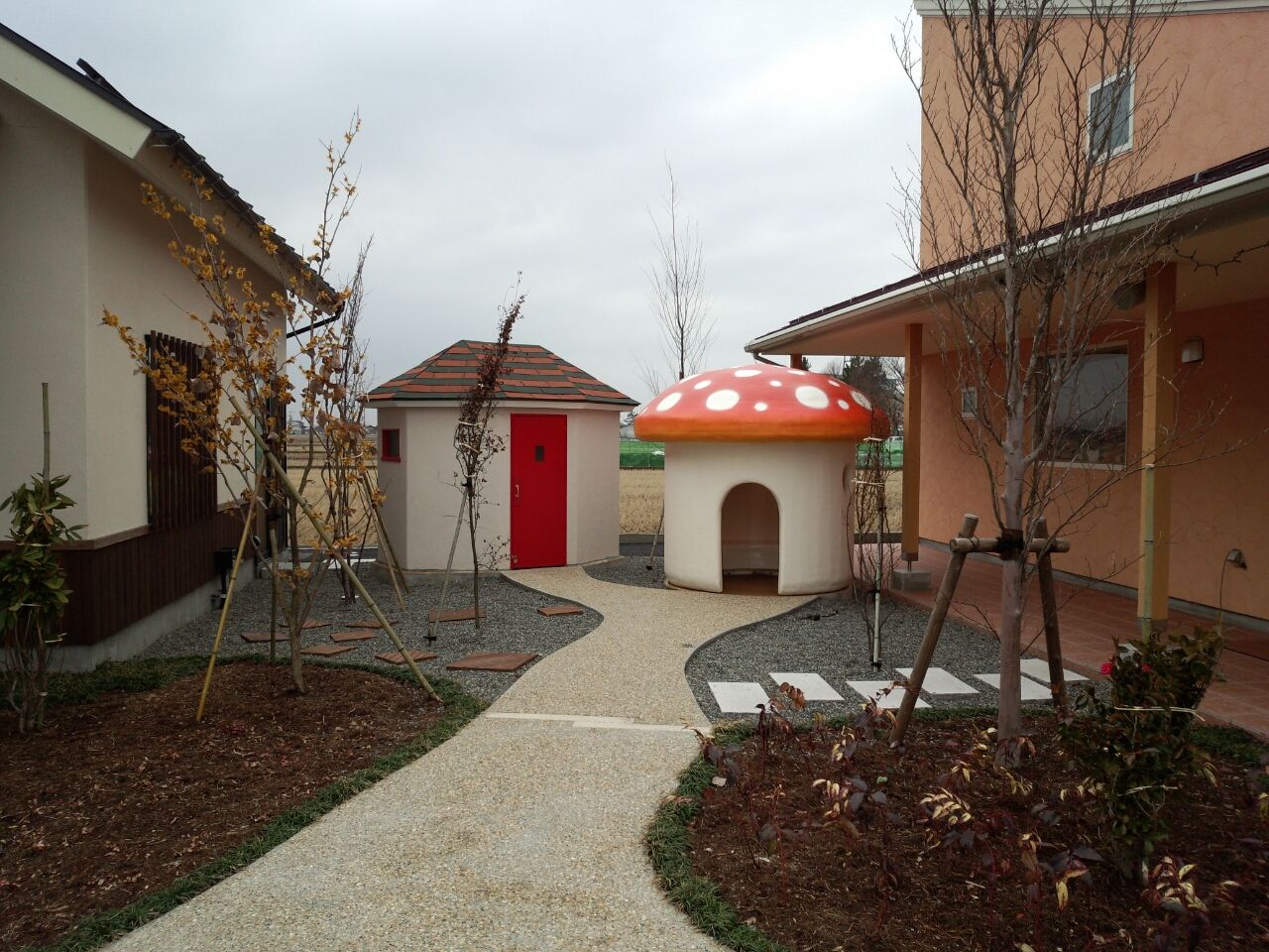 3つのお店とポップなきのこの建物が並ぶ。