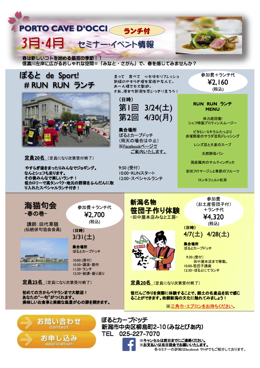 イベント名:①ぽるとde Sport ! RUN RUN ランチ、②笹団子作り体験