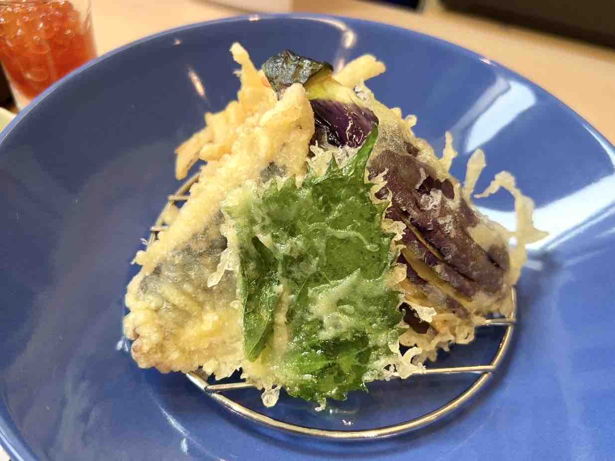 ナス、大葉、かき揚げ、魚。