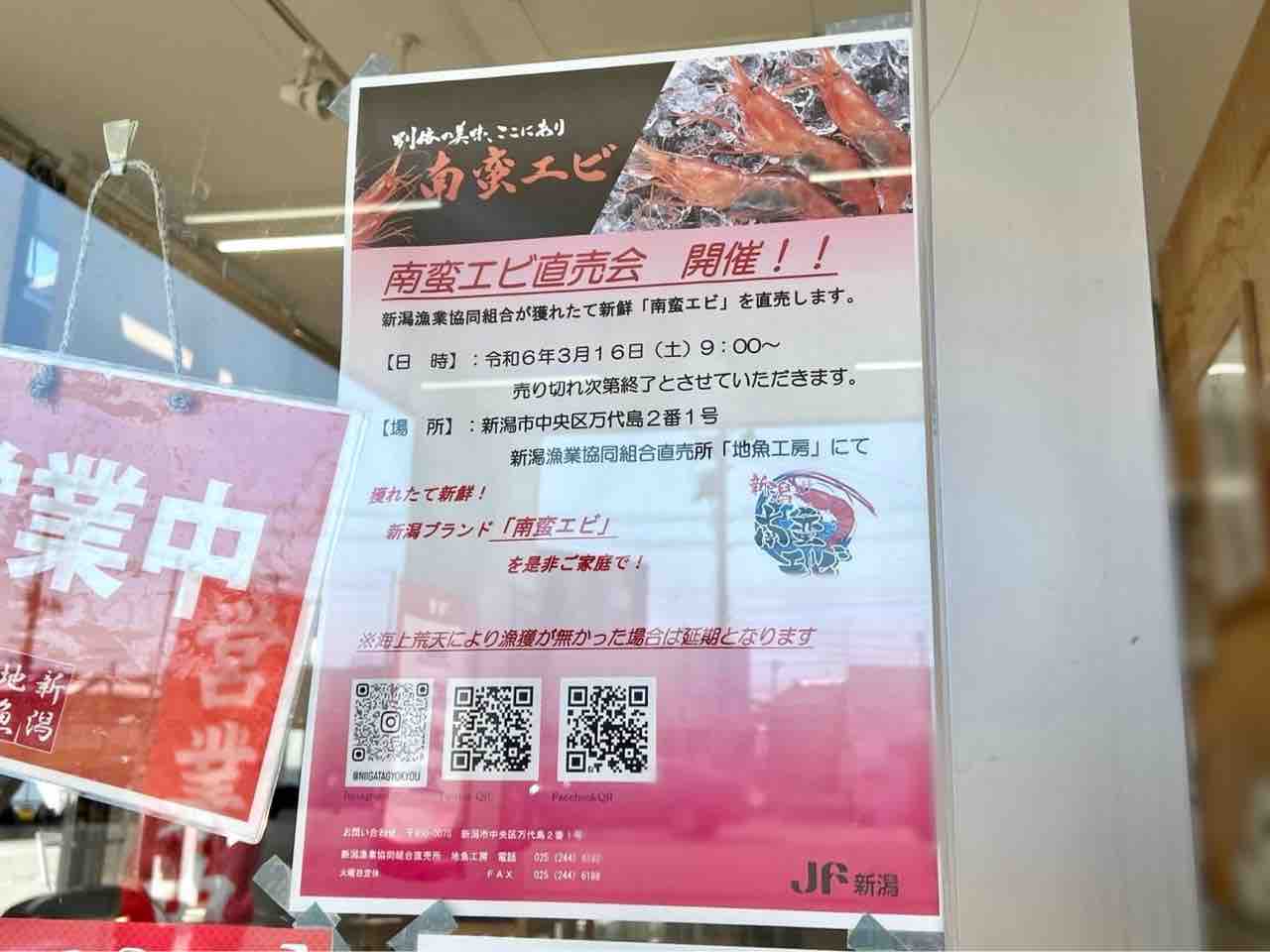 『南蛮エビ直売会』の貼り紙だ〜!!