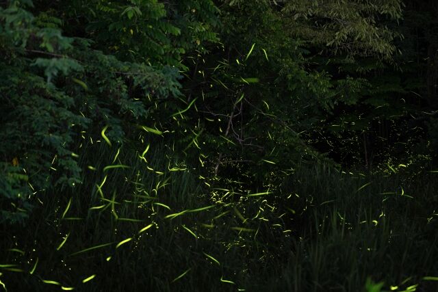 山間の杉木立を舞うたくさんのホタルが