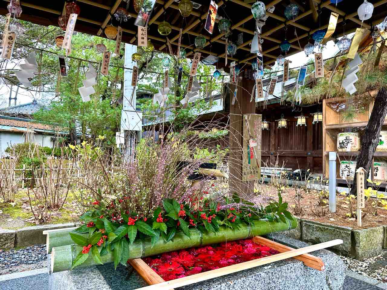 お花がいっぱいの手水で清める。