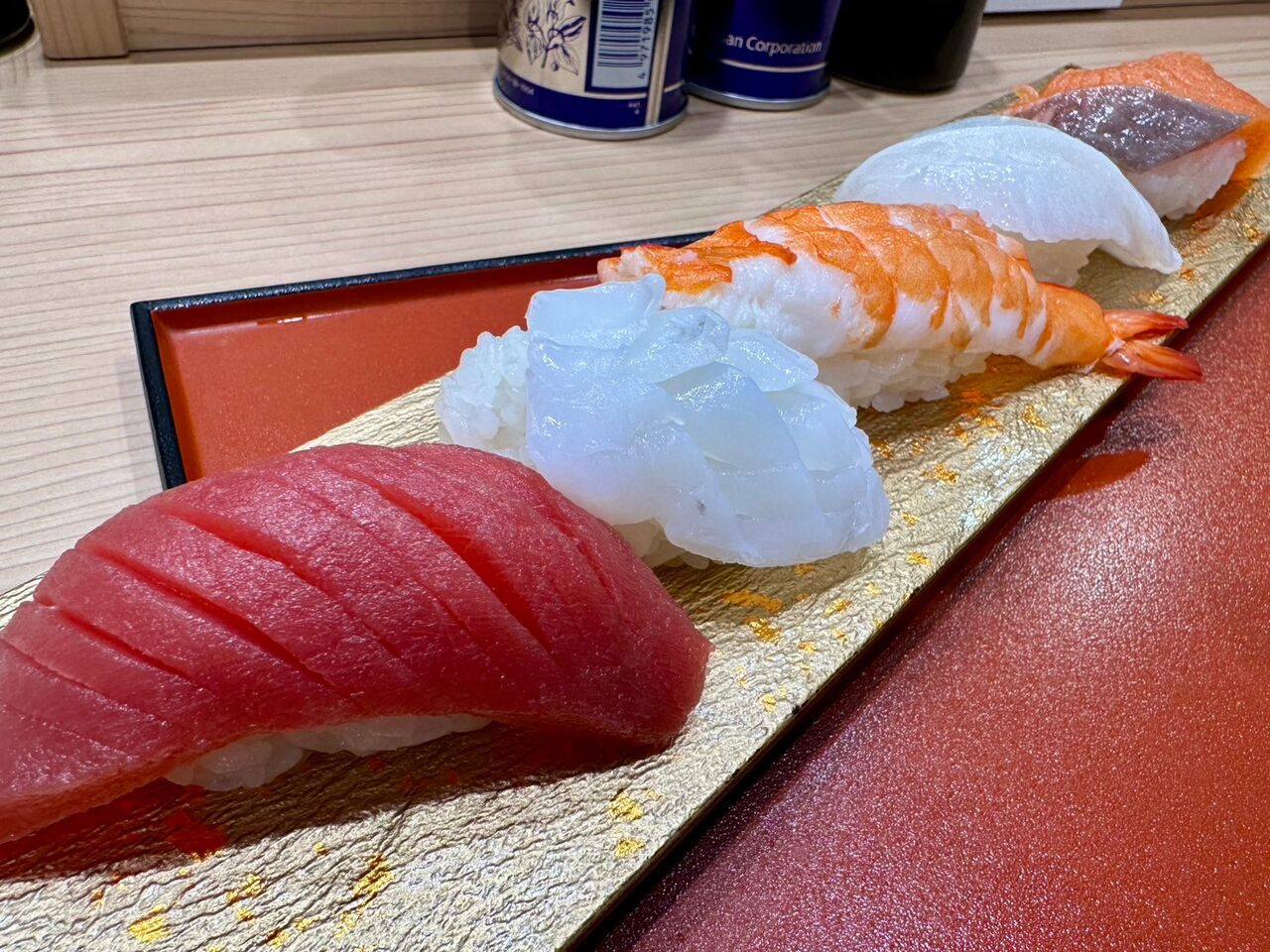 本マグロ、紋甲イカ、大蒸しエビ、