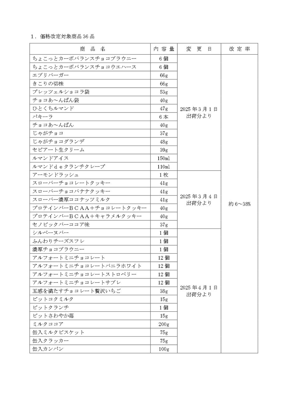 全部で36品。改定率は約6~38%。
