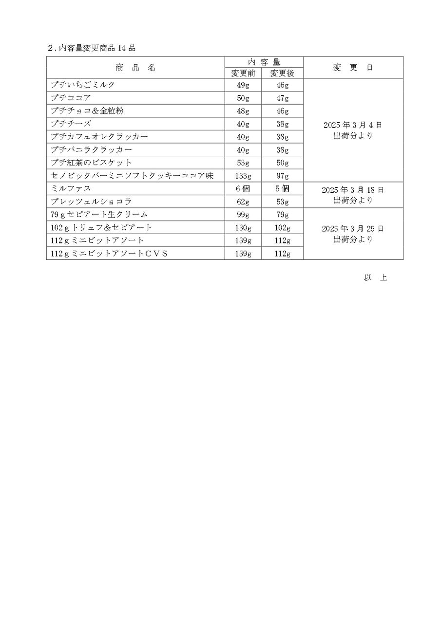 内容量変更する商品は、全部で14品。