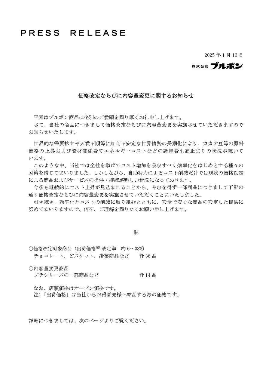 ※ブルボン価格改定並びに内容量変更に関するお知らせは、こちら。