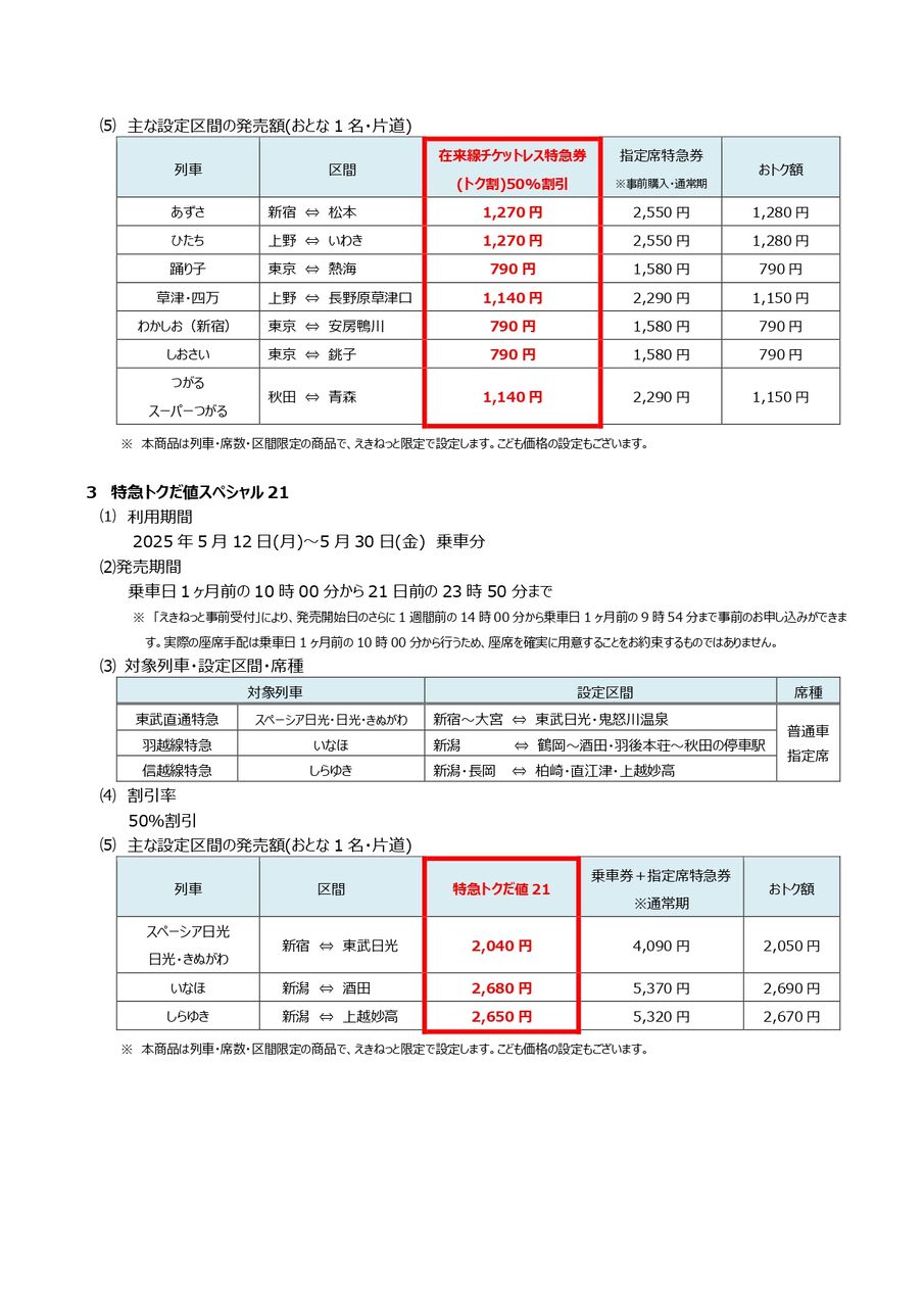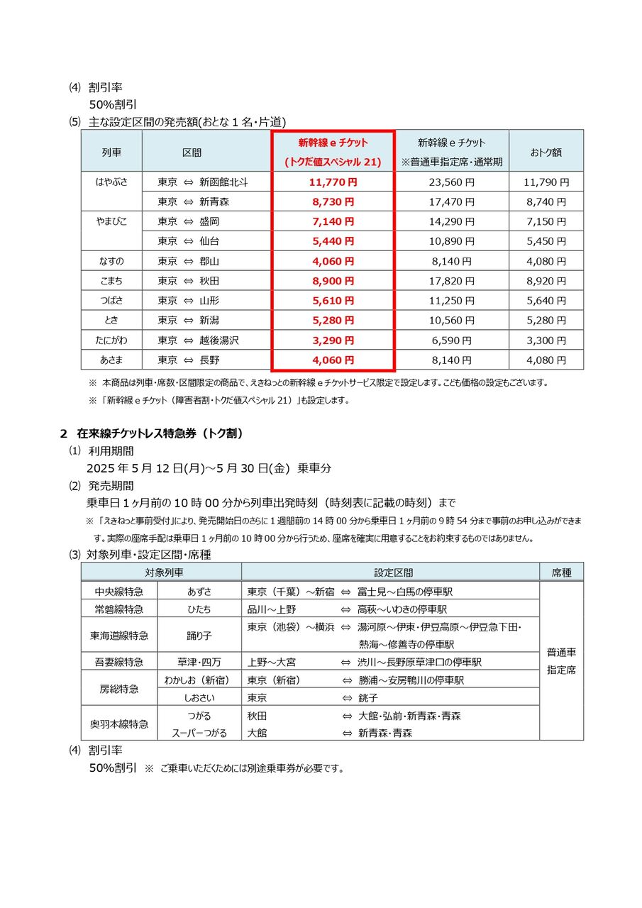 ※新幹線や在来線特急列車の50%割引についての詳細は、こちら。