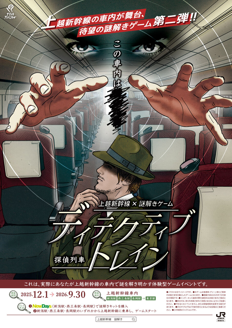 参加方法:①謎解きキットを販売店舗で購入。記載された二次元コードからスマートフォン等で専用ページを事前に設定後、乗車する新幹線と駅を選択。②新潟駅・燕三条駅・長岡駅のいずれかから上越新幹線に乗車。③列車の発車時刻と同時にスタート。