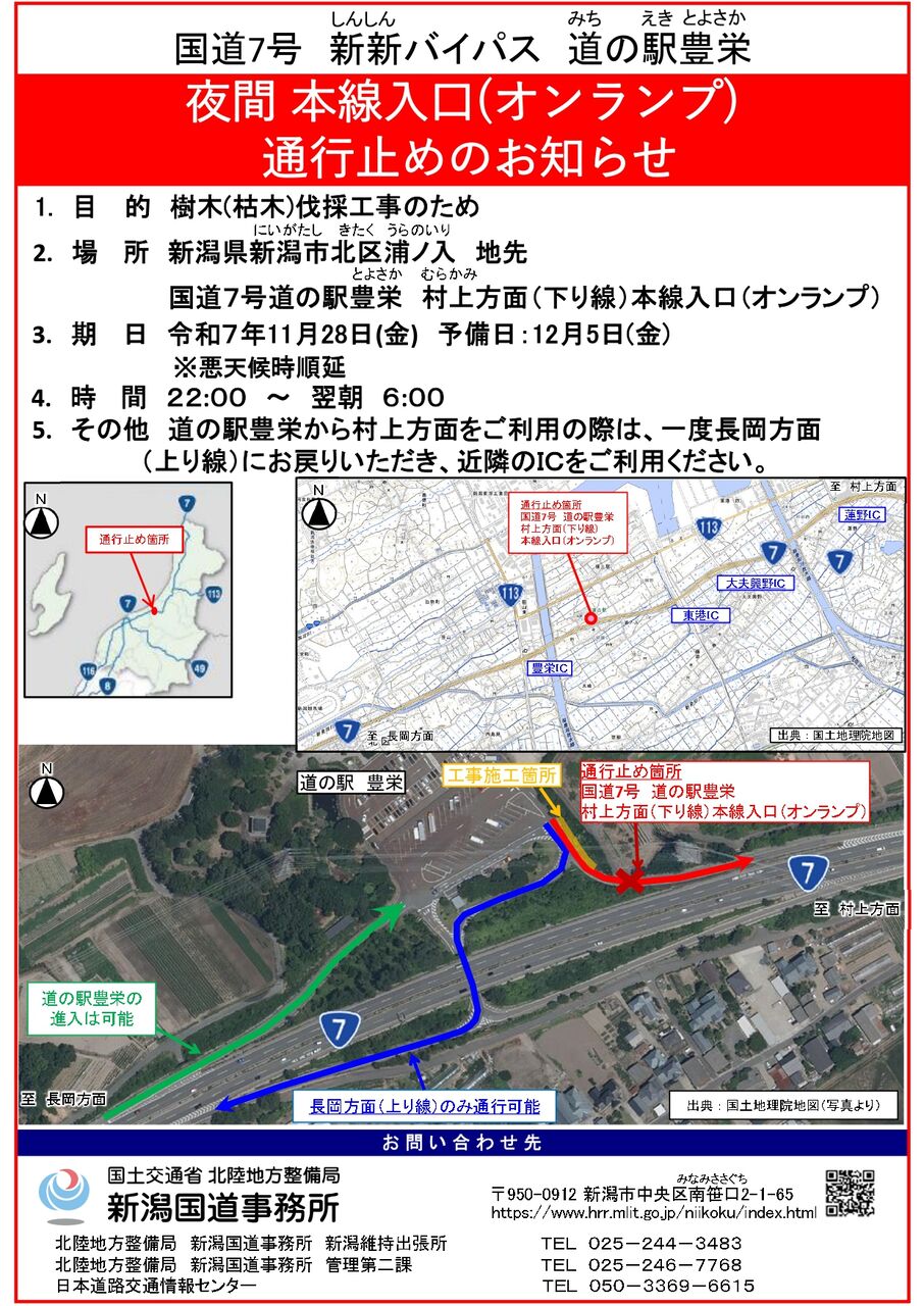 国道7号 新新バイパス 道の駅豊栄 夜間 本線入口(オンランプ)通行止め
