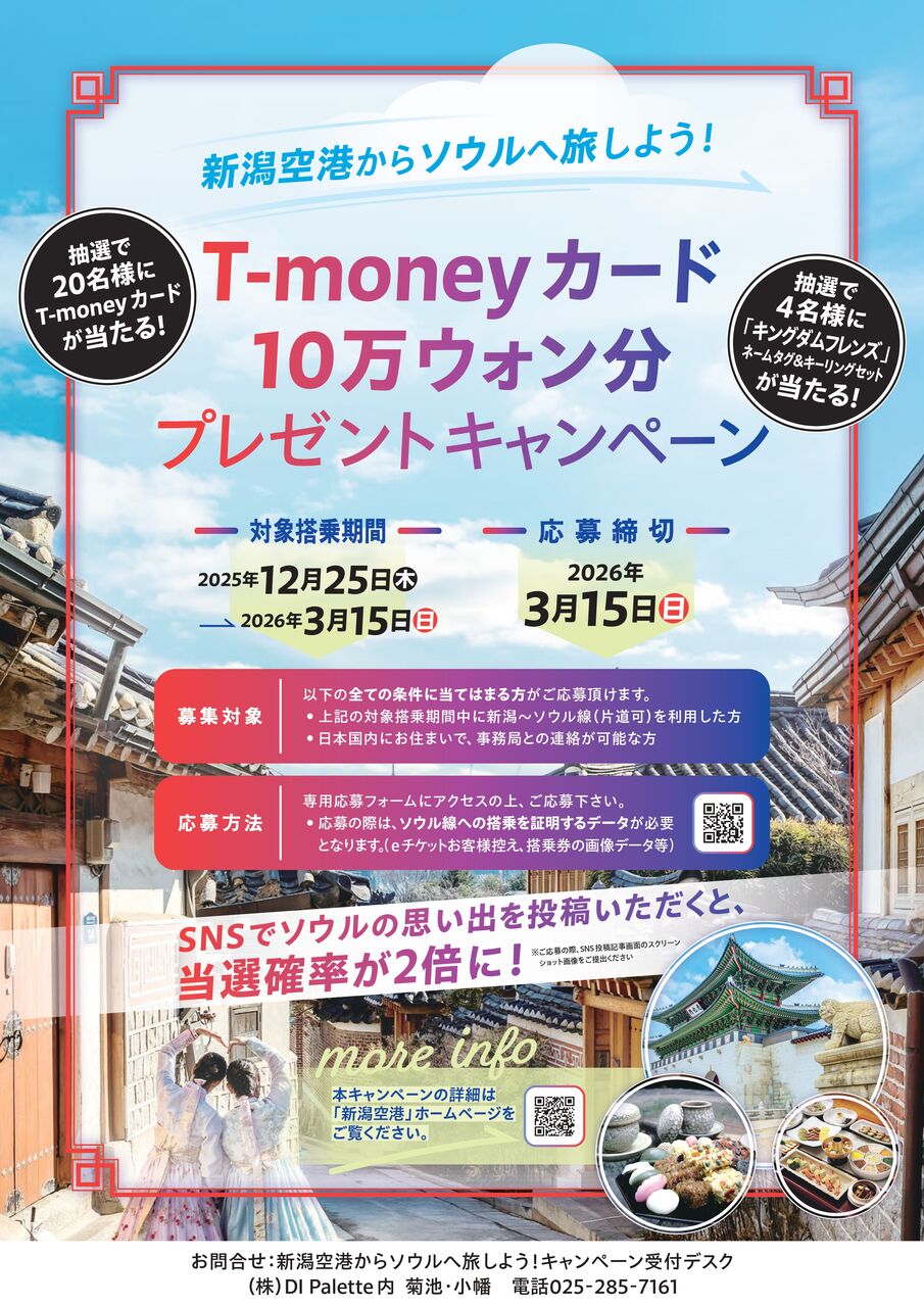 問合先:新潟空港からソウルへ旅しよう!キャンペーン受付デスク(DI Palette内)