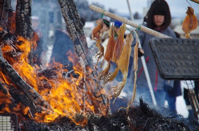 どんど焼きの炎で炙って食べる!
